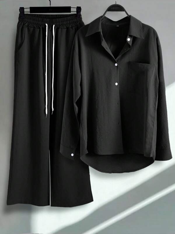 2pcs/Set Women Fashion Button-Up Shirt And Drawstring Pants Suit